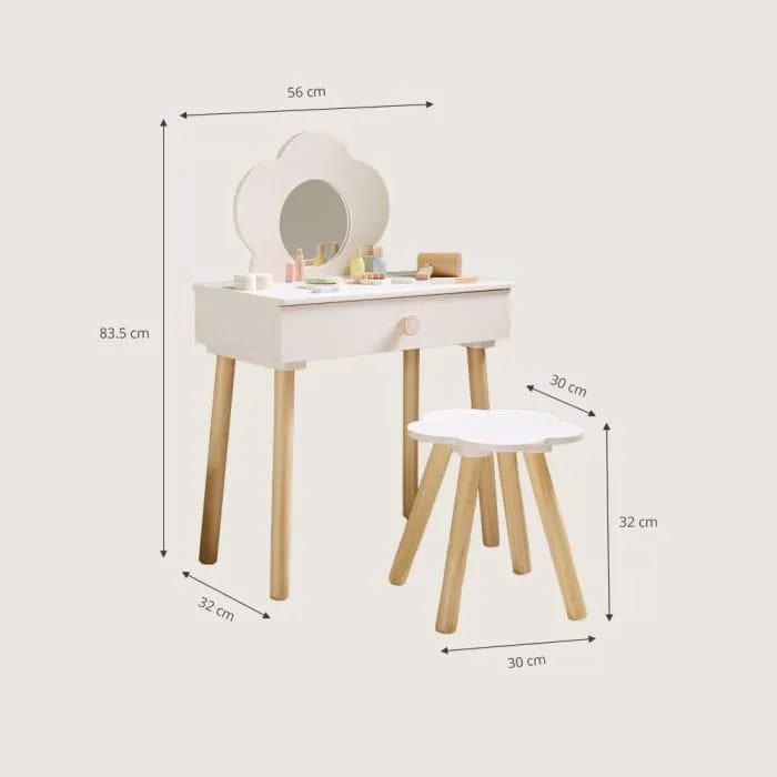 Crafted from durable and child-safe materials like wood, the set is built for stability and everyday use. Smooth edges, sturdy construction, and a comfortable chair ensure safety and comfort, while drawers provide convenient storage for toys, accessories, or pretend makeup items.