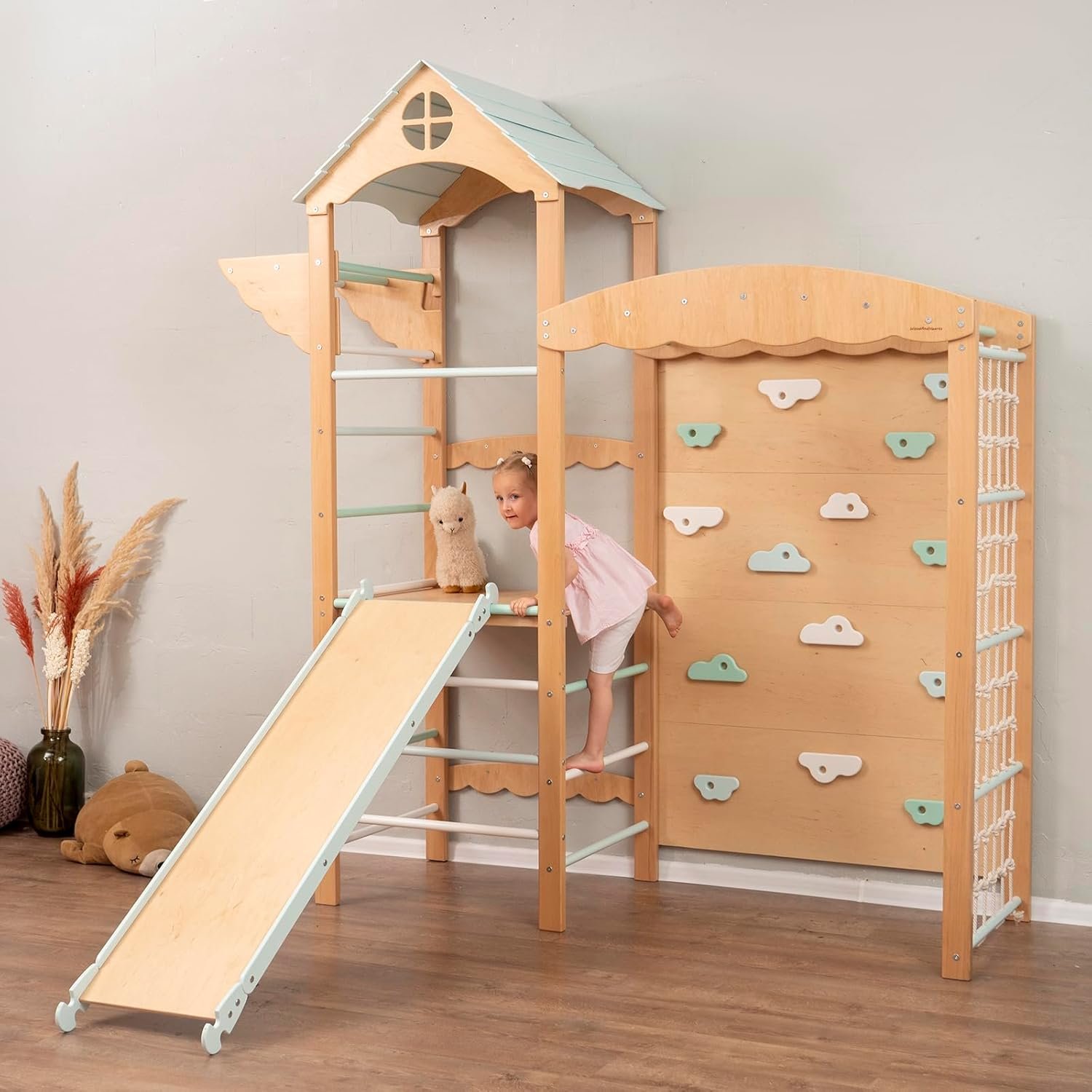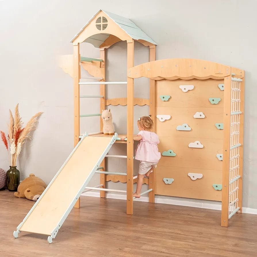 A toddler climbing gym with a rock climbing wall is a small indoor or outdoor play structure designed for young children to climb, explore, and stay active. It usually includes a mini rock wall with climbing holds, ladders, or slides that help toddlers develop strength, balance, and coordination through safe physical play.